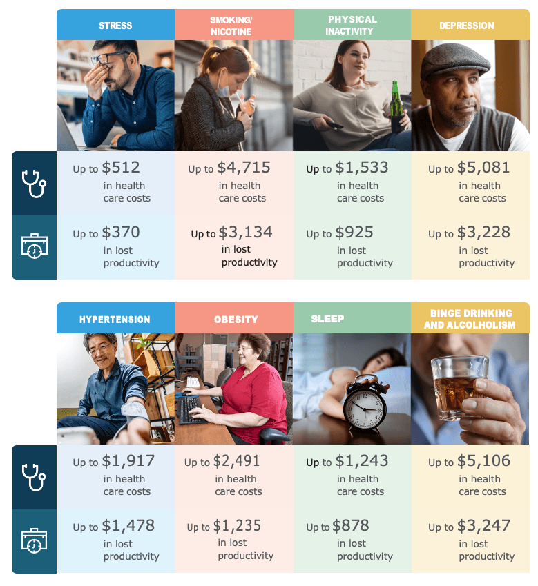 Unhealthy habits quietly cost employers thousands of dollars per employee each year. This page summarizes the latest research on healthcare spend and productivity loss tied to the most common modifiable unhealthy habits.