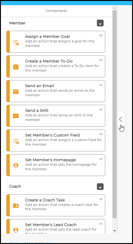 You can automate emails, SMS messages, member to-dos, goals, homepage changes, segmentation tags, coach tasks, and more. Triggers can be behavior-based (like course starts, missed appointments) or time-based.